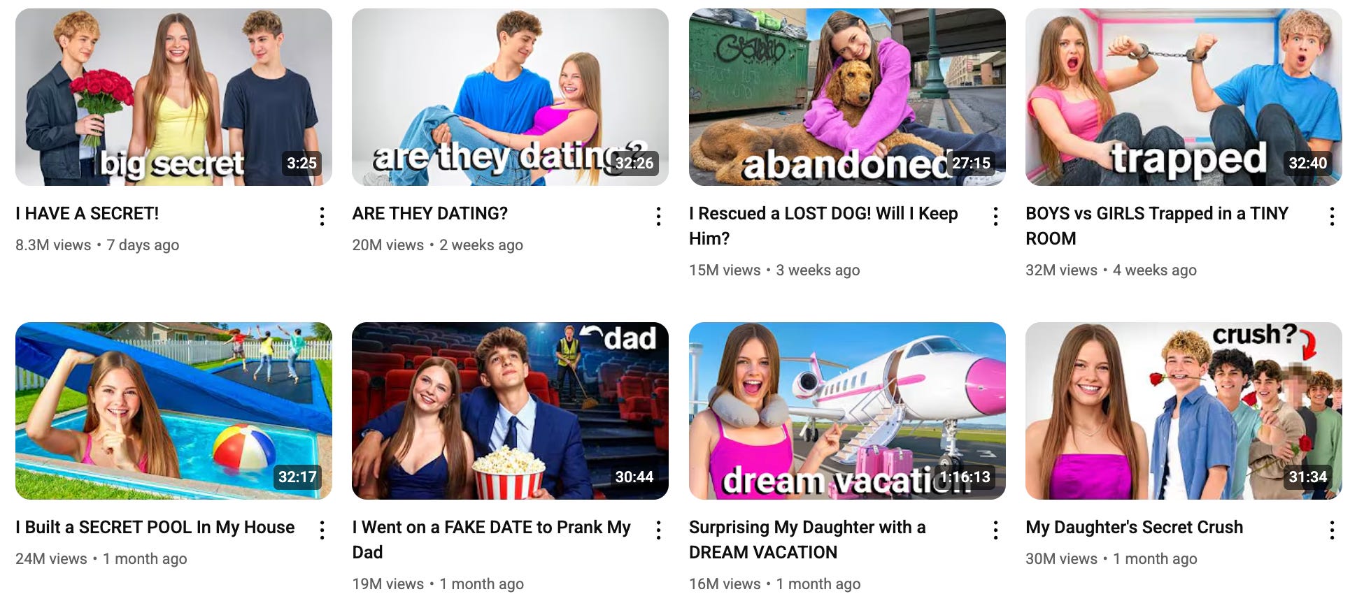Salish and her dad have taken the MrBeast playbook (eye-catching thumbnails, over-the-top challenges, click-driven storytelling) and tailored it to a Gen Alpha girl audience. Instead of million-dollar stunts and bro humor, their videos center on wholesome dares, tween friendship drama, and “shipping” sagas (“ARE THEY DATING?”).