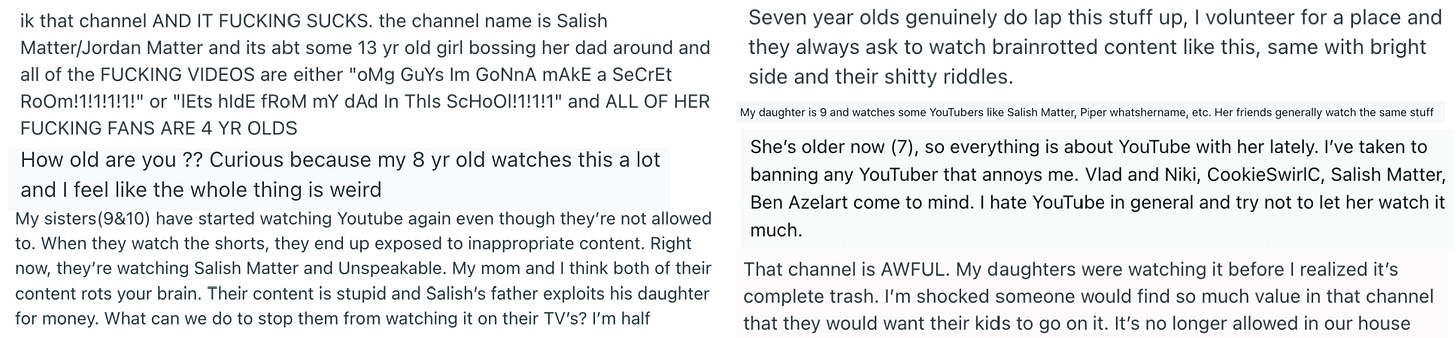 Before this week, I’d never heard of Salish, even though she has 3 million YouTube subscribers and her dad, who mostly posts about his daughter, has another 32 million. That’s because I am not her target audience. Who is her target audience? Based on my research, 7-year-olds.