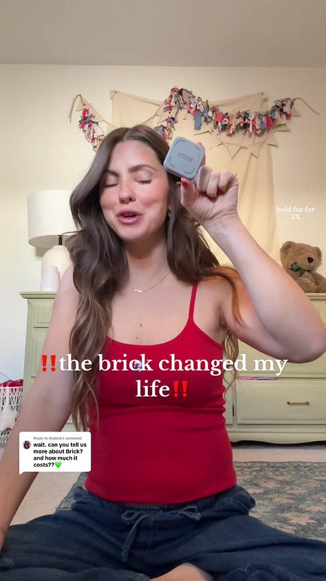 This week, Vogue wrote about Brick, a $60 magnetic device created by two Gen Z entrepreneurs that physically locks you out of social media apps and is currently going viral on the very platforms it’s designed to block. “Before Bricking, it was in the nine to 12 hour range with three or more hours a day on TikTok (which almost feels embarrassing to admit),” one content creator told the magazine. “But two weeks in, [my] overall screen time dropped to an average of four hours with 15 to 30 minutes a day on TikTok.” Another devotee said she “immediately felt a sense of relief” after getting one. The product has gotten big enough to inspire its own lingo; users say they’re “bricked up” when their phones are locked.